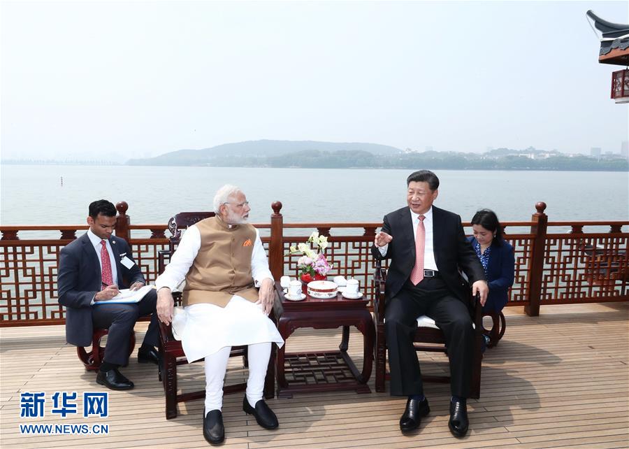 4月27日和28日,國家主席習近平在武漢東湖賓館同印度總理莫迪舉行非正式會晤。這是4月28日,習近平同莫迪交談。 新華社記者 鞠鵬 攝