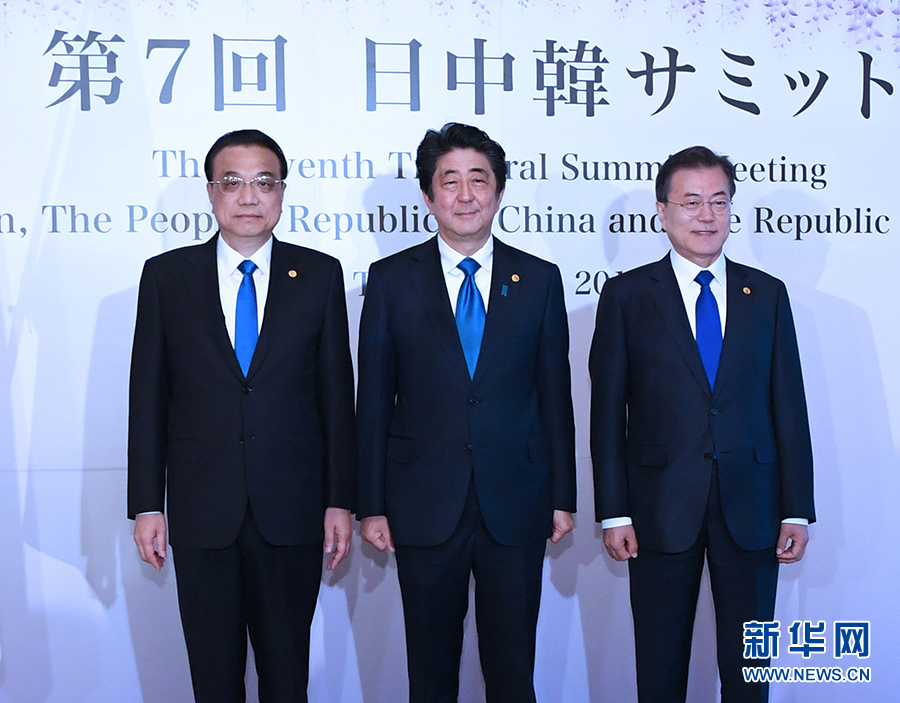 當地時間5月9日上午,國務院總理李克強在東京迎賓館同日本首相安倍晉三、韓國總統文在寅共同出席第七次中日韓領導人會議。 新華社記者饒愛民 攝