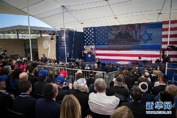 5月14日,在耶路撒冷,以色列總理內塔尼亞胡在美國駐以色列使館開館儀式上講話。在巴勒斯坦人的激烈抗議和多個國家的譴責聲中,美國駐以色列使館14日正式在耶路撒冷開館。 新華社/基尼圖片社