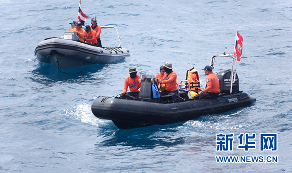 7月8日,在泰國普吉,泰國搜救船只在失事海域搜尋失聯人員。新華社記者秦晴攝