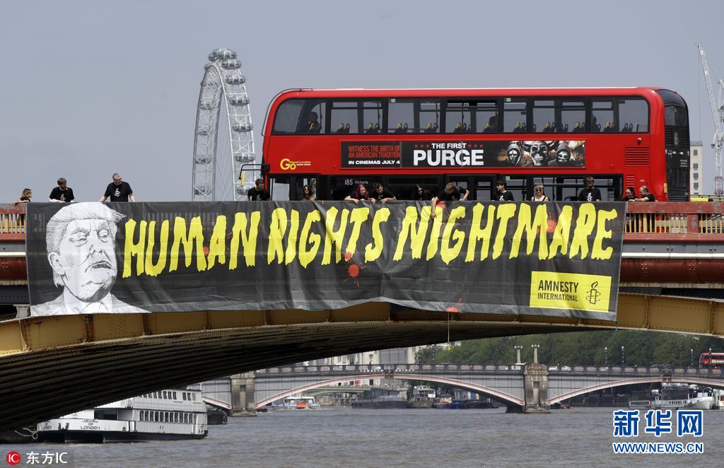 7月12日,英國倫敦,國際特赦組織成員在倫敦泰晤士河上沃克斯豪爾橋懸掛橫幅,抗議美國總統特朗普到訪英國。(圖片來源:東方IC)