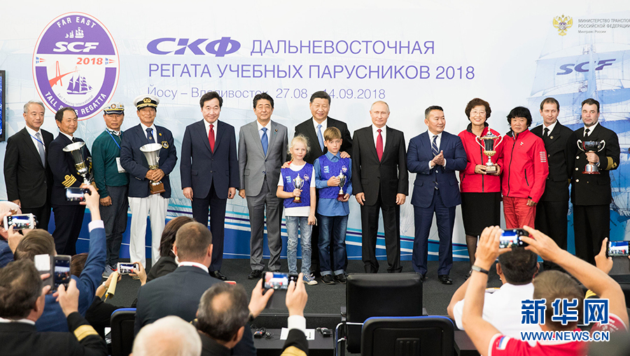 9月12日,第四屆東方經濟論壇全會在符拉迪沃斯托克舉行。中國國家主席習近平、俄羅斯總統普京、蒙古國總統巴特圖勒嘎、日本首相安倍晉三、韓國總理李洛淵等出席。這是全會后,與會各國領導人共同出席第三屆“遠東杯”國際帆船拉力賽第一賽段頒獎儀式。 新華社記者黃敬文攝