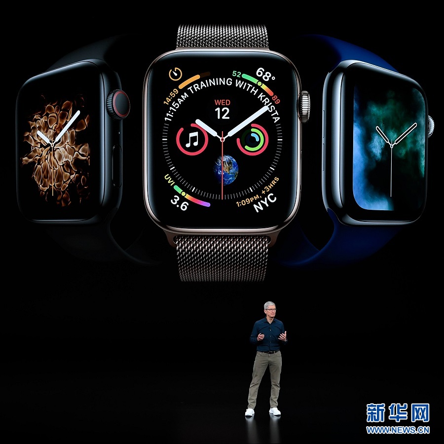 9月12日,在美國加利福尼亞州丘珀蒂諾市舉行的蘋果新品發布會上,蘋果公司首席執行官蒂姆·庫克介紹新推出的第四代蘋果手表。美國蘋果公司12日在加州丘珀蒂諾市舉行新品發布會,推出3款智能手機和第四代蘋果手表等產品。其中,手機雙卡雙待功能和手表健康監測應用廣受關注。 新華社發