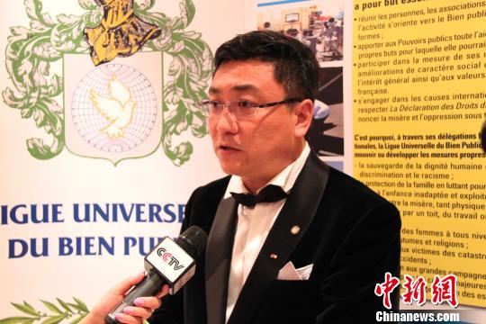 9月21日晚,中國工筆畫家崔景哲在巴黎榮獲全球公益聯(lián)盟文學(xué)(藝術(shù))金質(zhì)勛章,也是此次頒獎典禮所有獲獎?wù)咧形ㄒ灰晃恢袊恕D為崔景哲接受媒體采訪。李洋 攝