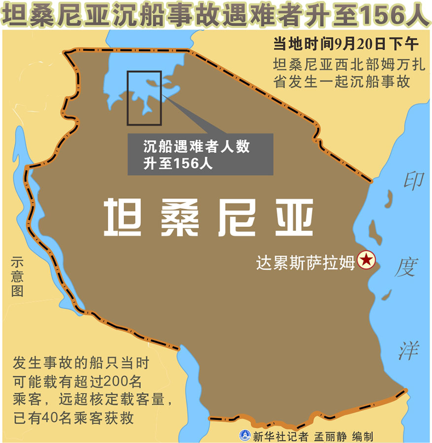 新華社達累斯薩拉姆9月22日電(記者李斯博 高竹)坦桑尼亞官員22日說,該國西北部姆萬扎省20日發生的沉船事故已造成至少156人死亡。