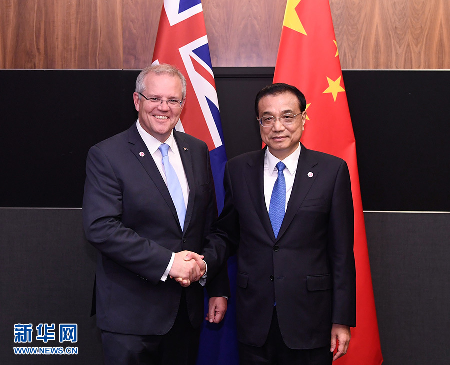 當(dāng)?shù)貢r(shí)間11月14日晚,國(guó)務(wù)院總理李克強(qiáng)在新加坡出席東亞合作領(lǐng)導(dǎo)人系列會(huì)議期間,同澳大利亞總理莫里森舉行第六輪中澳總理年度會(huì)晤。 新華社記者 申宏 攝