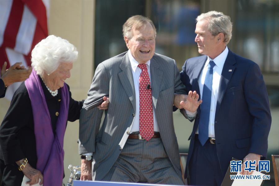 美國前總統喬治·赫伯特·沃克·布什辦公室11月30日晚發表聲明證實他于美國中部時間當晚10時許去世,享年94歲。這是2013年4月25日,在美國達拉斯,美國前總統喬治·赫伯特·沃克·布什(中)出席小布什總統圖書館落成典禮的資料照片。新華社發(許迅攝)