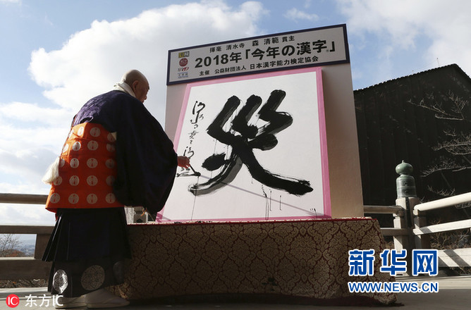 當地時間2018年12月12日,日本京都,京都清水寺住持森清范在巨幅和紙上揮毫寫下了今年的年度漢字——“災”。(圖片來源:東方IC)