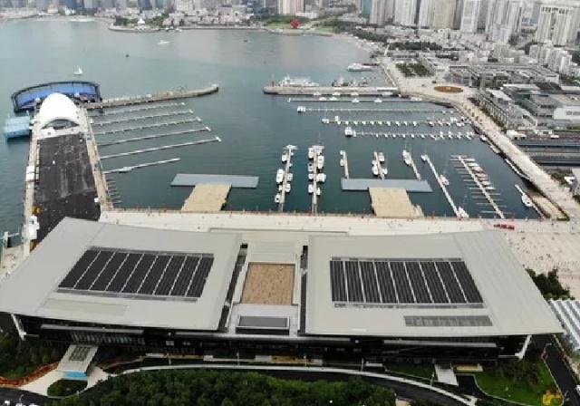 上合青島峰會主會場——青島國際會議中心經過短暫的會后內部服務功能規劃調整正式向游客開放(7月1日無人機拍攝)。新華社記者 李紫恒 攝