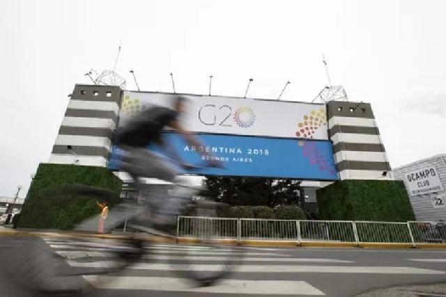 2018年11月27日,在阿根廷首都布宜諾斯艾利斯,一名市民騎車經過G20峰會會場——科斯塔·薩爾格羅會展中心。新華社記者 李明 攝