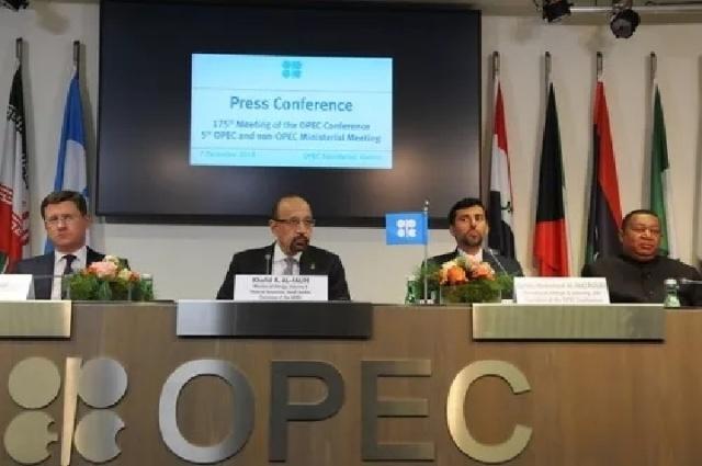 2018年12月7日,在奧地利維也納的石油輸出國組織(歐佩克)總部,俄羅斯能源部長諾瓦克、沙特阿拉伯能源、工業和礦產大臣法利赫、阿拉伯聯合酋長國能源部長馬茲魯伊與歐佩克秘書長巴爾金多(從左至右)出席新聞發布會。當日,石油輸出國組織(歐佩克)與非歐佩克產油國達成協議,決定從2019年1月開始日均減產原油120萬桶,初步設定期限為6個月。 新華社記者 劉向 攝