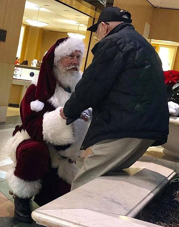 12月9日,美國(guó)特拉華州,一位裝扮成“圣誕老人”的男子向一位路過的二戰(zhàn)老兵屈膝致敬。