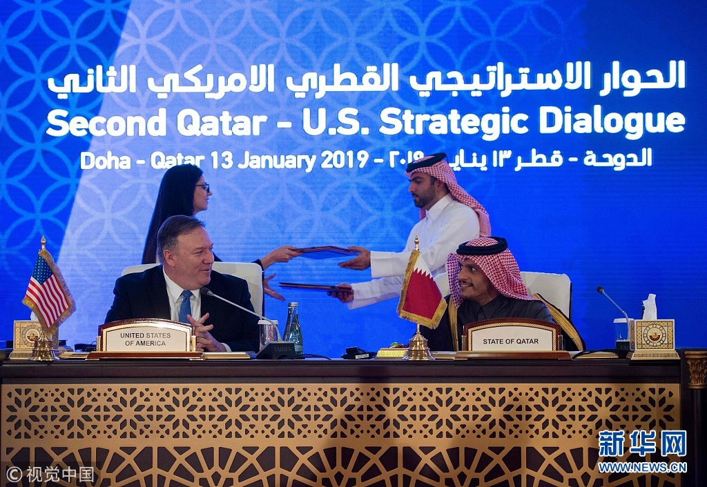 2019年1月13日,卡塔爾多哈,美國國務(wù)卿邁克·蓬佩奧訪問卡塔爾。蓬佩奧與卡塔爾副首相兼外交大臣穆罕默德在多哈的喜來登大酒店簽署了諒解備忘錄和意向聲明并舉行聯(lián)合記者會(huì)。蓬佩奧表示,兩國外交部門領(lǐng)導(dǎo)人當(dāng)天簽署了一份諒解備忘錄,將擴(kuò)建和改造烏代德美國空軍基地。(圖片來源:視覺中國)