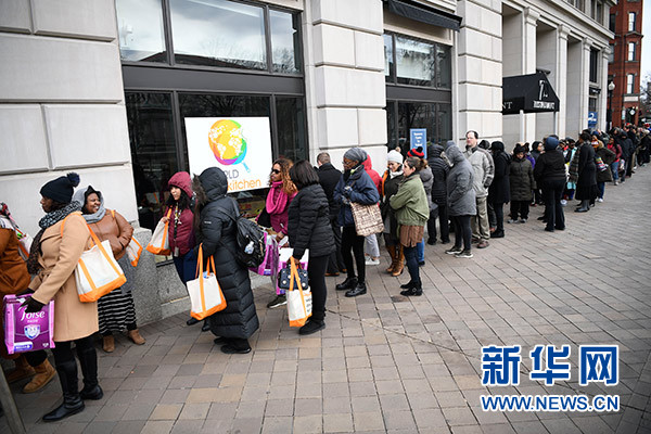政府“停擺”依舊,冬寒并未遠走,華盛頓哥倫比亞特區的道路上行人稀少、商戶門廳冷清,但在國家廣場附近一處街角卻見人排起了長隊。