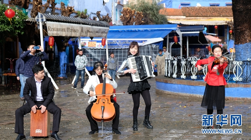 2月1日,在摩洛哥“藍色小鎮”舍夫沙萬,重慶市歌劇院的演員們進行快閃表演。新華社記者陳斌杰 攝