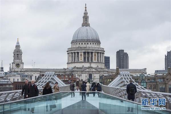 這是3月6日,在英國(guó)倫敦,人們從通往倫敦金融城的千禧橋上走過(guò)。 新華社發(fā)(史蒂芬·程 攝)