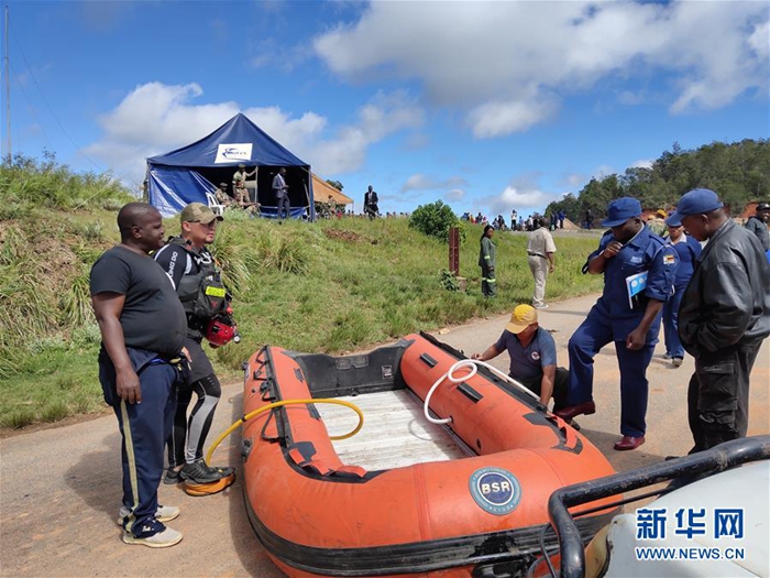 3月20日,在津巴布韋馬尼卡蘭省奇平吉,中國志愿者與當地民眾為救援艇充氣。新華社發