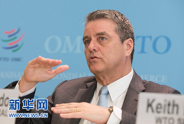 4月2日,在瑞士日內(nèi)瓦,世貿(mào)組織總干事阿澤維多出席記者會。 新華社記者 徐金泉 攝