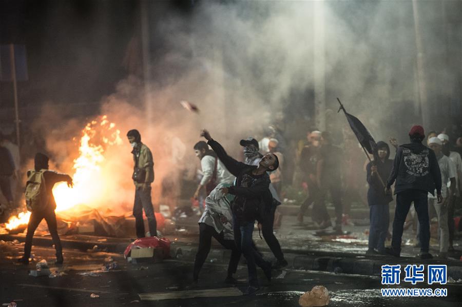 5月22日,在印度尼西亞首都雅加達,一名示威者投擲石塊。新華社發(維里 攝)