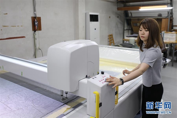這是5月17日在日本和歌山縣,岡田織物公司的工作人員使用合作研發的專用機器剪裁人造毛皮。新華社記者 杜瀟逸 攝