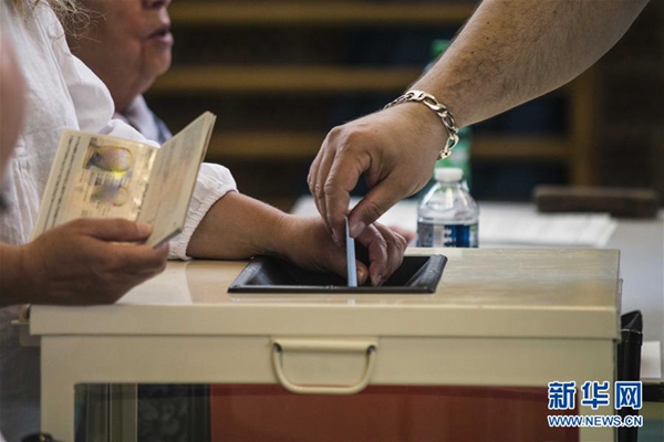 5月26日,在法國斯特拉斯堡,選民在一處投票站投票。新華社發(馬丁·勒列夫爾 攝)