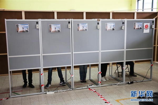 5月26日,在比利時布魯塞爾,選民在一處投票站準備投票。新華社記者 鄭煥松 攝
