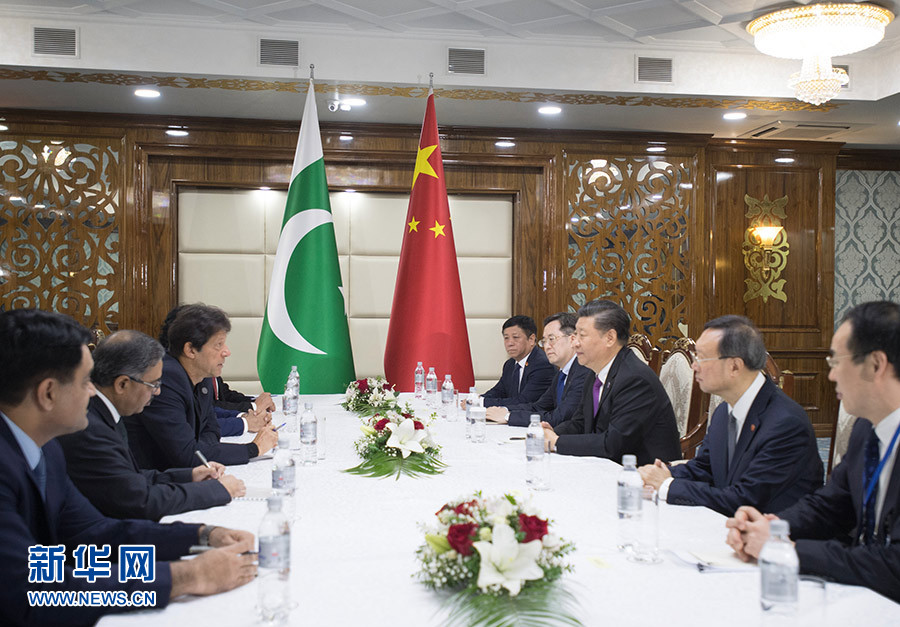 6月14日,國家主席習近平在比什凱克會見巴基斯坦總理伊姆蘭·汗。 新華社記者 李學仁 攝
