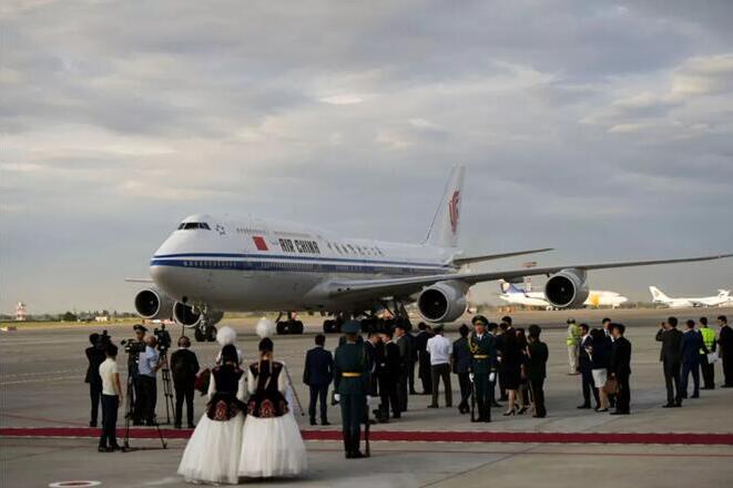 首都比什凱克的國(guó)際機(jī)場(chǎng)也以“瑪納斯”命名。12日傍晚,晚霞中的瑪納斯國(guó)際機(jī)場(chǎng),習(xí)近平主席步出專(zhuān)機(jī)艙門(mén),與熱情迎接的熱恩別科夫總統(tǒng)雙手緊握在一起。