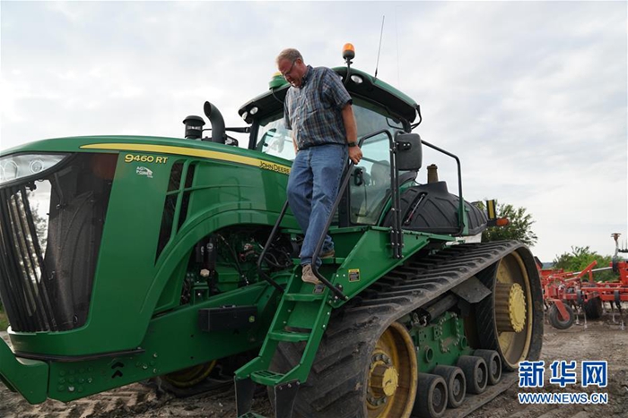 6月9日,在位于美國中部密蘇里州的小鎮奧里克,湯姆·沃特斯從一輛拖拉機上下來。新華社記者 劉杰 攝