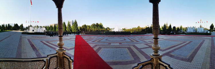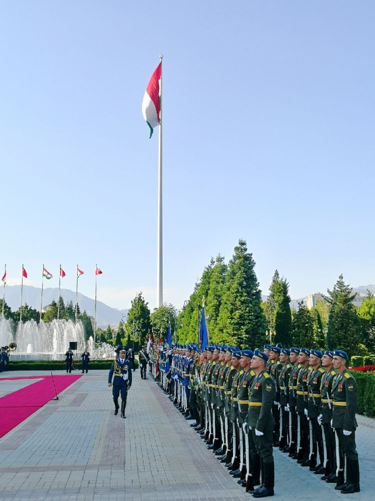 儀仗隊在塔吉克斯坦總統府列隊,等候兩國元首檢閱。遠處高聳的旗桿位于總統府外的國旗公園,高165米,是杜尚別的地標建筑之一。新華社記者 霍小光 攝