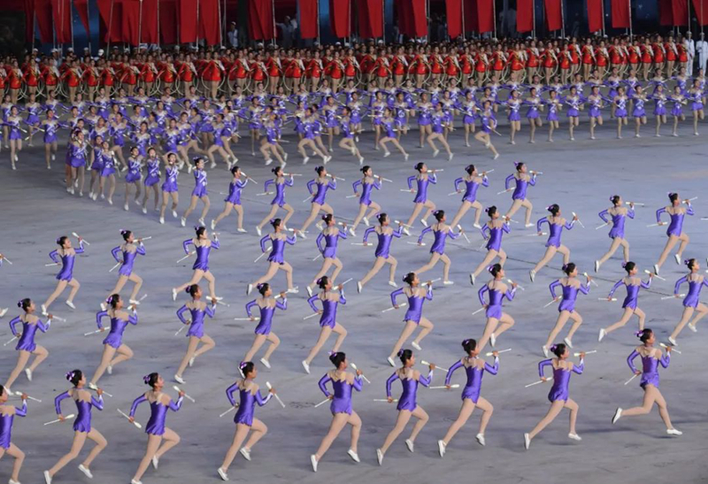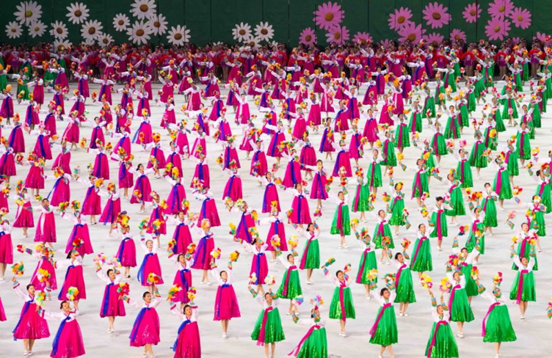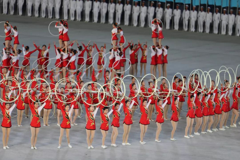 平壤大同江畔,綾羅島“五一”體育場是團體操的主要舞臺。演出以朝鮮民族獨特的“歌舞之美”、富有活力的團體操、嘆為觀止的雜技表演,展現(xiàn)出朝鮮革命與戰(zhàn)爭、政治和軍隊建設、民生與經(jīng)濟發(fā)展以及對外交往的宏偉畫卷。