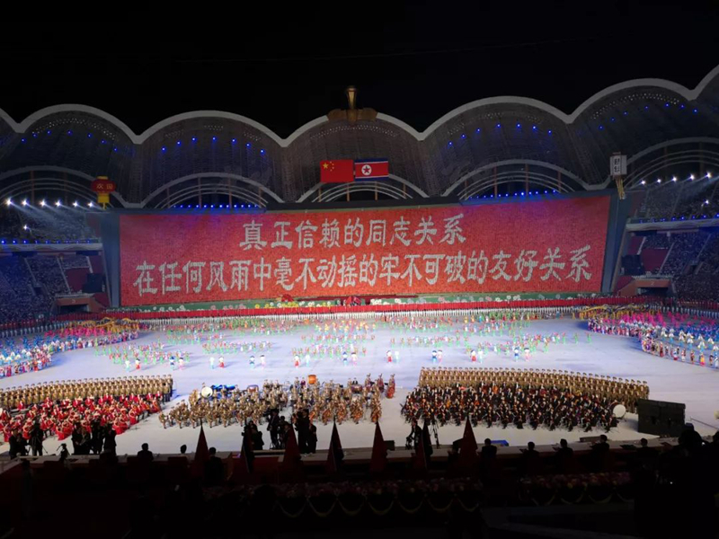 演出在以“朝中友誼萬古長青”為主題的大型歌舞表演中結束。習近平和金正恩同全場觀眾一起站立,為藝術家和演員們的精湛表演送上經(jīng)久不息的掌聲。