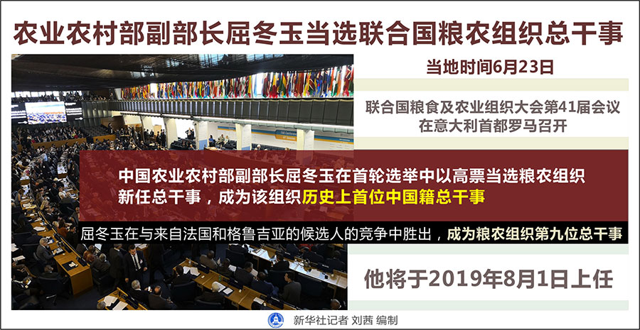 當日,屈冬玉在與來自法國和格魯吉亞的候選人的競爭中勝出,成為糧農(nóng)組織第九位總干事。他將于今年8月1日上任。