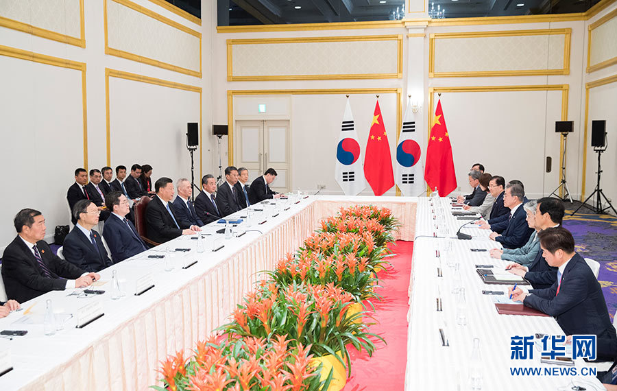 6月27日,國(guó)家主席習(xí)近平在日本大阪會(huì)見(jiàn)韓國(guó)總統(tǒng)文在寅。 新華社記者 黃敬文 攝