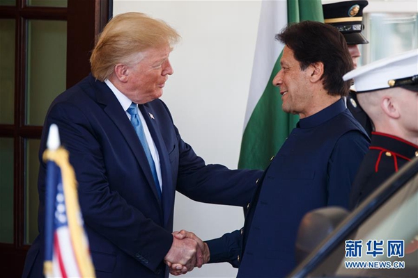 7月22日,在美國華盛頓白宮,美國總統特朗普(左)歡迎巴基斯坦總理伊姆蘭·汗。新華社發(沈霆 攝)