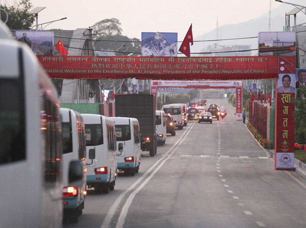 10月12日,尼泊爾首都加德滿都,車隊經(jīng)過一道道迎賓拱門。新華社記者丁林攝