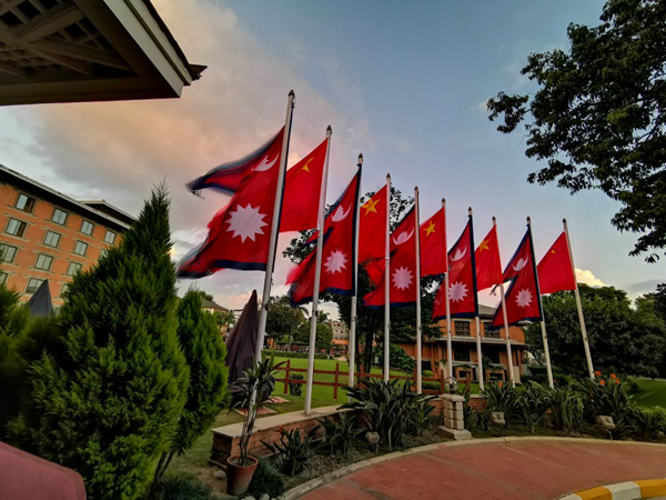 習近平主席在加德滿都下榻的飯店院內(nèi)飄揚著中尼兩國國旗。新華社記者賴向東攝