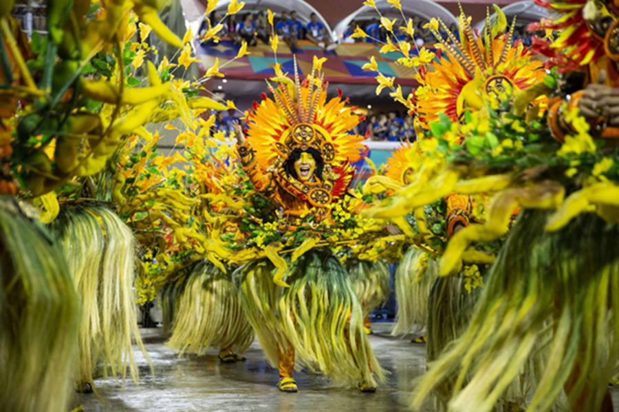 2019年3月4日晚,在巴西里約熱內盧,桑巴舞校演員參加狂歡節(jié)游行。新華社記者李明攝