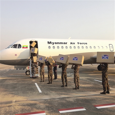 2月25日清晨迎著朝陽,緬甸國防軍使用空軍飛機運送N95級別口罩、護目鏡、防護服等醫(yī)療捐助物資前往中國,旨在幫助中國抗擊新冠肺炎疫情,緬甸國防軍總參謀長妙通烏上將、駐緬甸大使陳海、使館武官熊韶煒等在內(nèi)比都機場送行。光明日報駐仰光記者鹿鋮攝/光明圖片