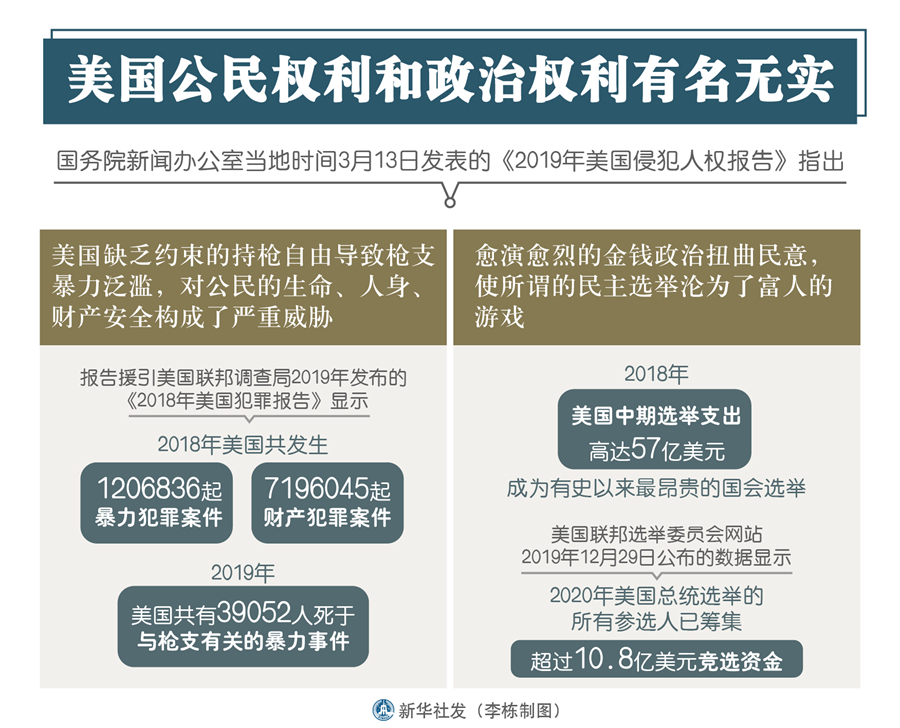 新華社北京3月13日電(記者王子銘、賈釗)國(guó)務(wù)院新聞辦公室13日發(fā)表的《2019年美國(guó)侵犯人權(quán)報(bào)告》指出,美國(guó)缺乏約束的持槍自由導(dǎo)致槍支暴力泛濫,對(duì)公民的生命、人身、財(cái)產(chǎn)安全構(gòu)成了嚴(yán)重威脅;愈演愈烈的金錢政治扭曲民意,使所謂的民主選舉淪為了富人的游戲。