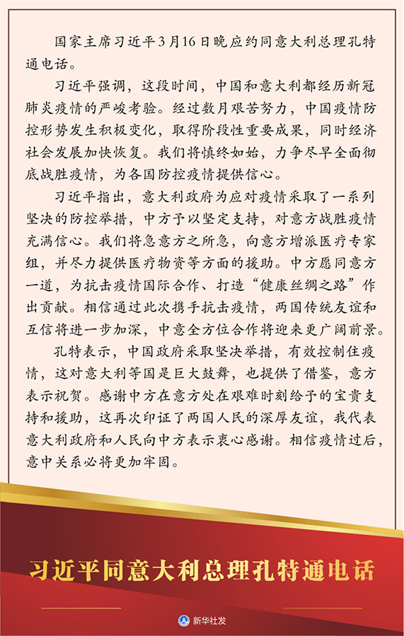 習近平指出,意大利政府為應對疫情采取了一系列堅決的防控舉措,中方予以堅定支持,對意方戰勝疫情充滿信心。我們將急意方之所急,向意方增派醫療專家組,并盡力提供醫療物資等方面的援助。中方愿同意方一道,為抗擊疫情國際合作、打造“健康絲綢之路”作出貢獻。相信通過此次攜手抗擊疫情,兩國傳統友誼和互信將進一步加深,中意全方位合作將迎來更廣闊前景。