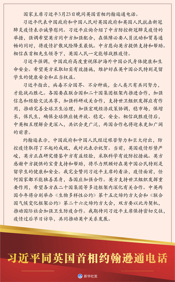 習近平指出,病毒不分國界、不分種族,全人類只有共同努力,才能戰而勝之。各國要在聯合國和二十國集團框架內推進合作,加強信息和經驗交流共享,加強科研攻關合作,支持世衛組織發揮應有作用,推動完善全球衛生治理,加強宏觀經濟政策協調,穩市場,保增長,保民生,確保全球供應鏈開放、穩定、安全。相信戰勝疫情后,中英相互理解會更深入,共識會更廣泛,兩國合作也將迎來更加廣闊的前景。
