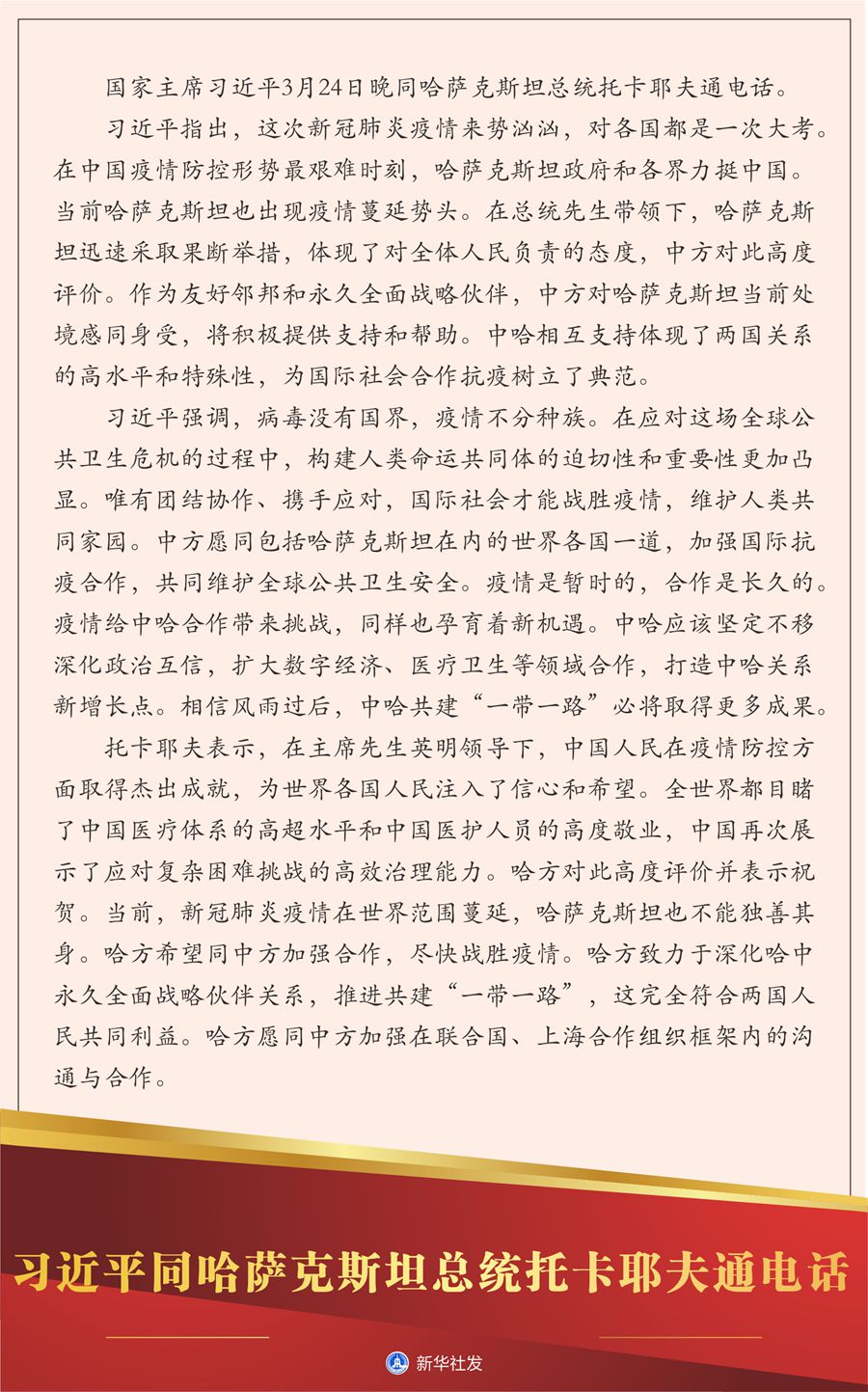 習(xí)近平指出,這次新冠肺炎疫情來勢洶洶,對各國都是一次大考。在中國疫情防控形勢最艱難時(shí)刻,哈薩克斯坦政府和各界力挺中國。當(dāng)前哈薩克斯坦也出現(xiàn)疫情蔓延勢頭。在總統(tǒng)先生帶領(lǐng)下,哈薩克斯坦迅速采取果斷舉措,體現(xiàn)了對全體人民負(fù)責(zé)的態(tài)度,中方對此高度評價(jià)。作為友好鄰邦和永久全面戰(zhàn)略伙伴,中方對哈薩克斯坦當(dāng)前處境感同身受,將積極提供支持和幫助。中哈相互支持體現(xiàn)了兩國關(guān)系的高水平和特殊性,為國際社會合作抗疫樹立了典范。