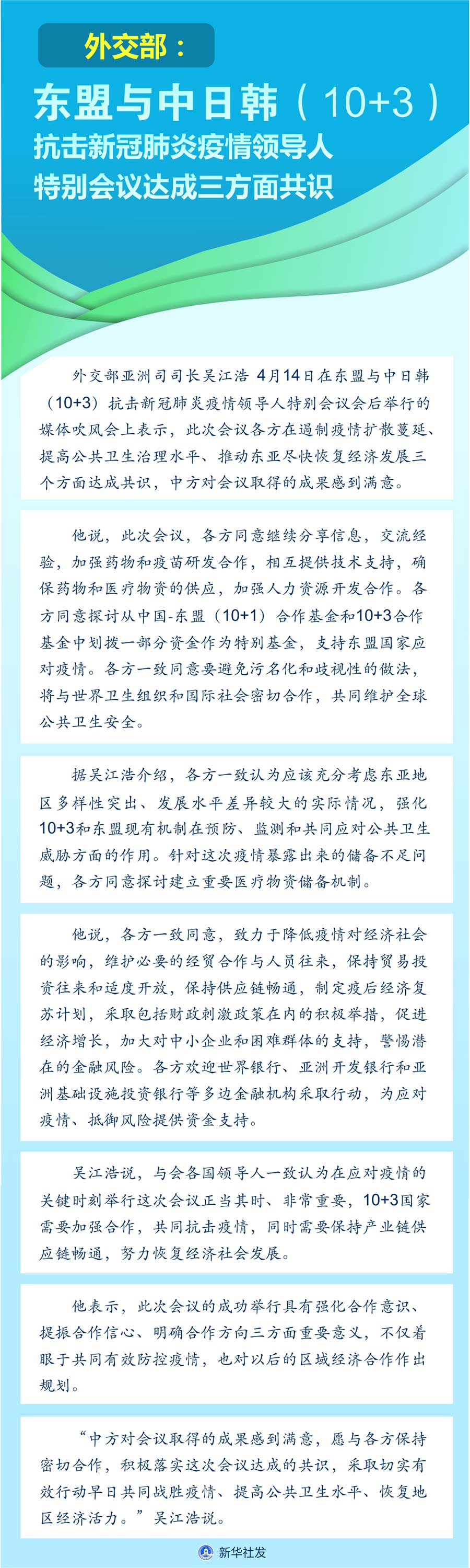 新華社北京4月14日電(記者伍岳)外交部亞洲司司長吳江浩14日在東盟與中日韓(10+3)抗擊新冠肺炎疫情領(lǐng)導(dǎo)人特別會議會后舉行的媒體吹風(fēng)會上表示,此次會議各方在遏制疫情擴(kuò)散蔓延、提高公共衛(wèi)生治理水平、推動?xùn)|亞盡快恢復(fù)經(jīng)濟(jì)發(fā)展三個(gè)方面達(dá)成共識,中方對會議取得的成果感到滿意。