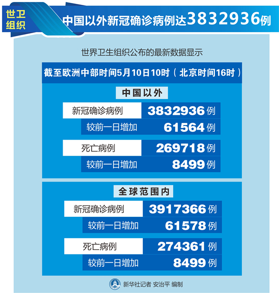 新華社日內瓦5月10日電(記者劉曲)世界衛生組織10日公布的最新數據顯示,中國以外新冠確診病例達到3832936例。