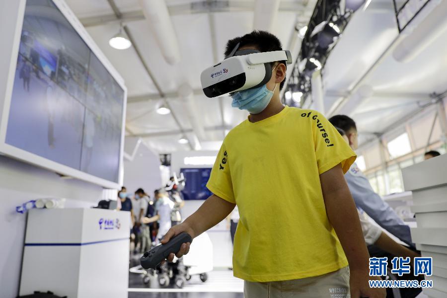 9月5日,一名小朋友在服貿會5G通信服務專題專區體驗VR游戲。新華社記者 李木子 攝