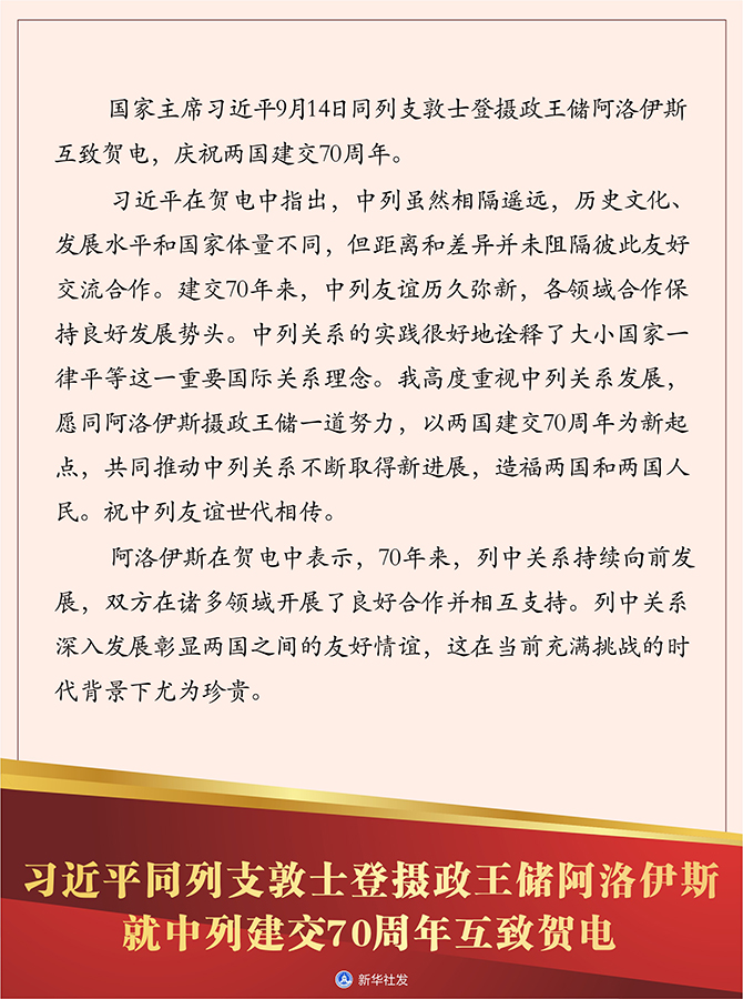 習近平在賀電中指出,中列雖然相隔遙遠,歷史文化、發展水平和國家體量不同,但距離和差異并未阻隔彼此友好交流合作。建交70年來,中列友誼歷久彌新,各領域合作保持良好發展勢頭。中列關系的實踐很好地詮釋了大小國家一律平等這一重要國際關系理念。我高度重視中列關系發展,愿同阿洛伊斯攝政王儲一道努力,以兩國建交70周年為新起點,共同推動中列關系不斷取得新進展,造福兩國和兩國人民。祝中列友誼世代相傳。