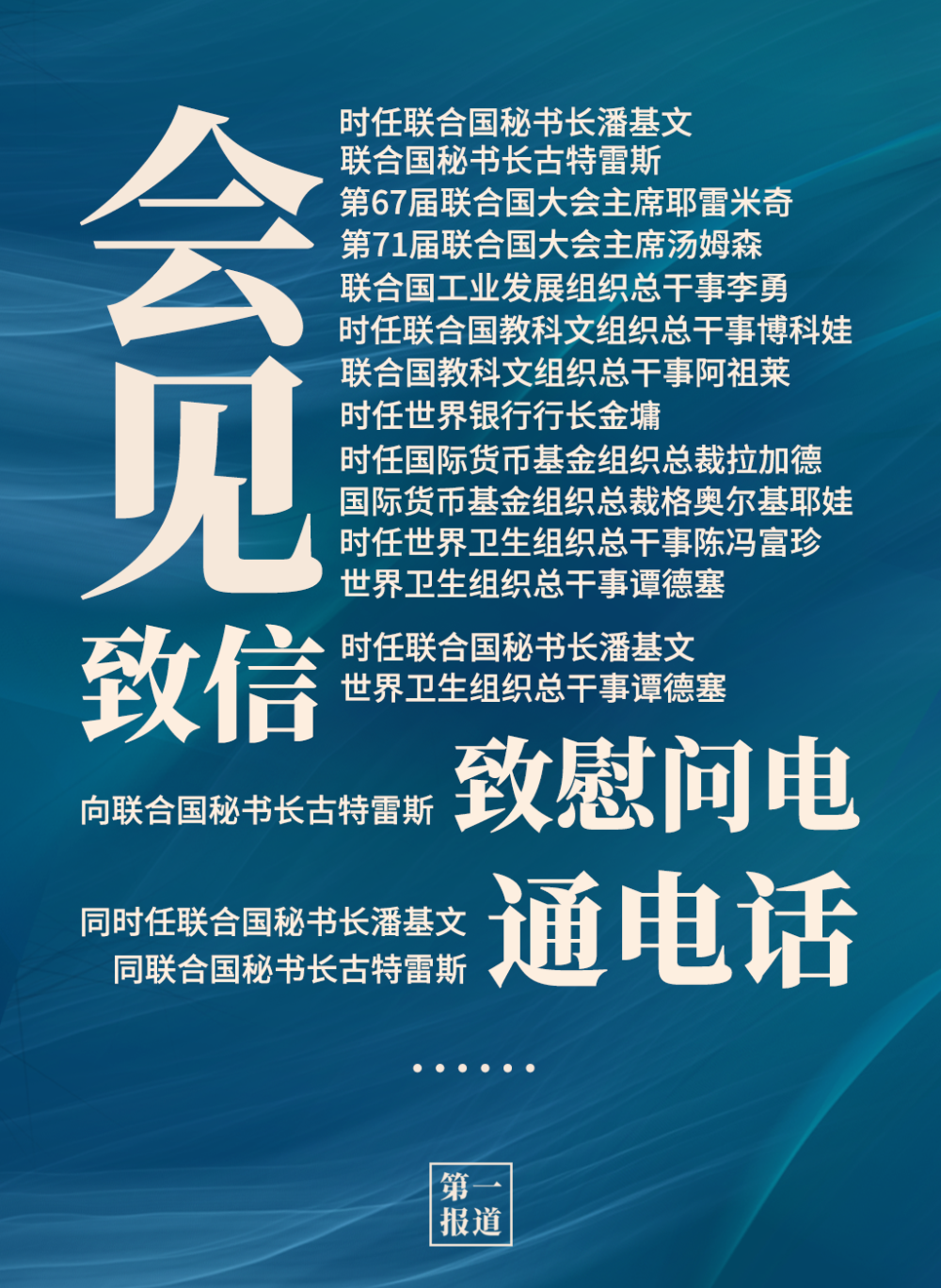 2013年以來,習主席通過會見、通話、致信函等多種方式同聯合國主要官員保持密切溝通。互動對象包括聯合國秘書長、聯合國大會主席,還有聯合國工業發展組織、聯合國教科文組織、世界銀行、國際貨幣基金組織、世界衛生組織等聯合國專門機構主要負責人。