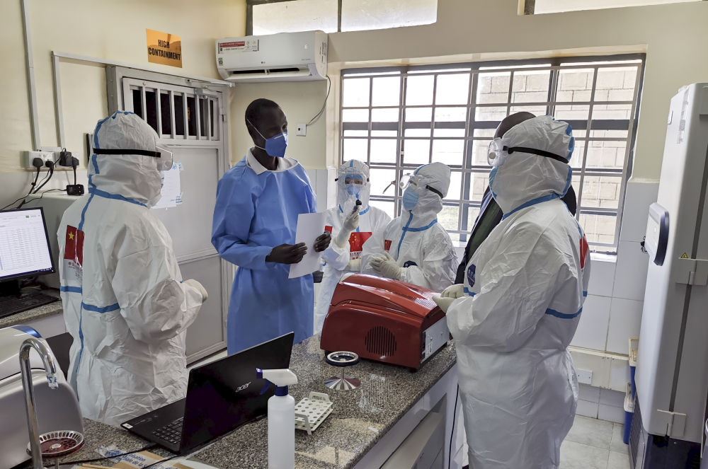 在南蘇丹首都朱巴的一處新冠病毒檢測機構,中國抗疫醫療專家組成員與南一線醫護人員交流(8月21日攝)。 新華社發(中國駐南蘇丹大使館供圖)
