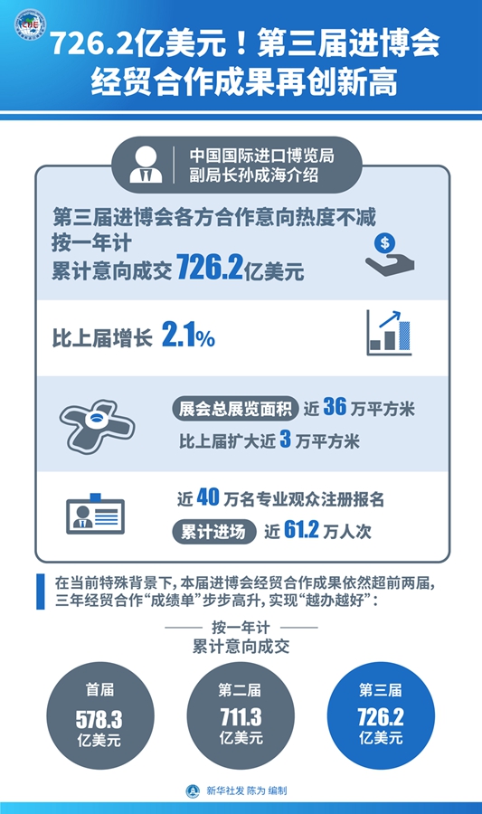 圖表:726.2億美元!第三屆進(jìn)博會(huì)經(jīng)貿(mào)合作成果再創(chuàng)新高 新華社發(fā) 陳為 編制